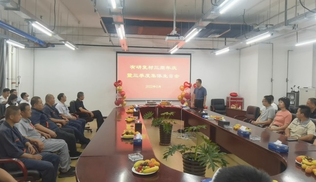9月19日,有研复材举办公司成立3周年庆暨三季度集体生日会。党总支书记、董事长樊建中出席并讲话。总经理、工会主席陈春生,财务总监、总法律顾问赵彩霞,副总经理马志新,火炬特材副总经理李祥、杨玉卫出席会议。公司部分员工及在读研究生参加会议。