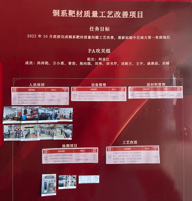 为全力保障铜系靶材质量工艺改善,专项工作领导小组下设“PA攻关组”,宣传委员何金江为第一责任人,攻关组从人员、设备、原材料、环境和工艺等方面着手,改善铜系靶材生产工艺。
