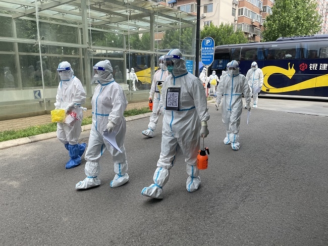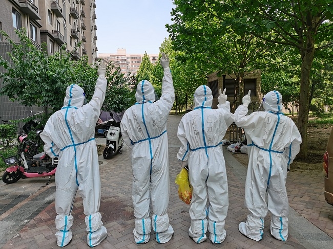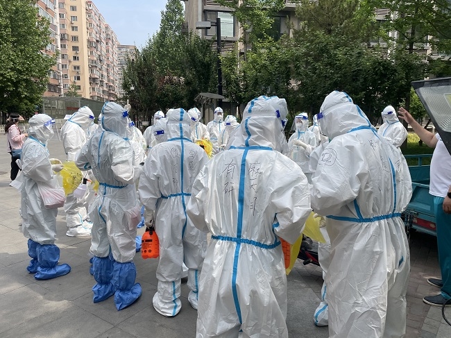 上午8点许,志愿者们集合完毕。按照社区工作安排,入户采样工作陆续开始。志愿者们配合核酸检测医务人员,挨家挨户敲门通知、收还身份证、细心进行身份登记,每栋楼、每个单元、每一楼层、每个人,确保无一遗漏。当天北京的最高气温到达32℃,志愿者和医务人员们身着密不透风的防护服,任凭衣物被汗水浸透、面罩被水汽模糊,却始终坚守在志愿岗位上,尽职尽责地完成自己的工作使命。许多志愿者们顾不上吃早饭,一直坚持空腹工作到下午3点。