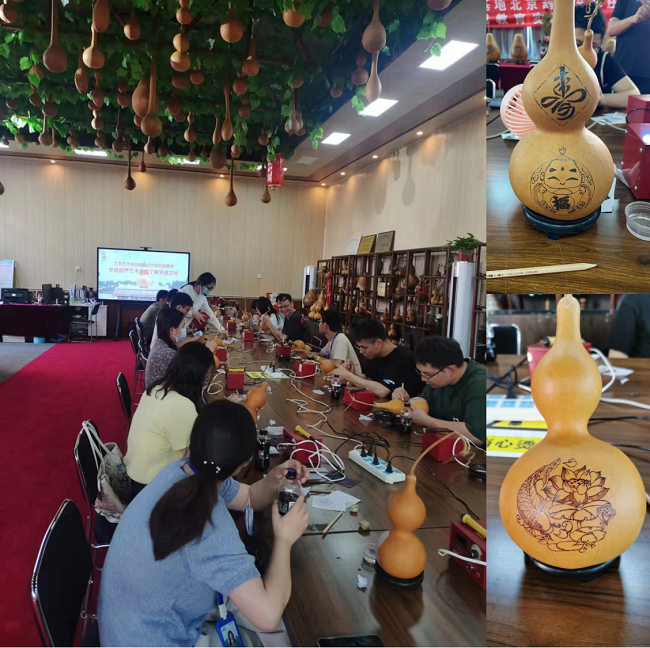 活动中,广大团员青年来到柳庄户村史馆,参观馆内陈列的各种老物件,通过观看现场逼真地农耕劳作场景,让大家深切的感受到了中国乡村从落后的农耕生产向现代化农业的发展变迁,充分体会党民同心的人文情怀。随后,大家在北京葫芦艺术庄园爱国主义教育基地,凝听非遗传承人“葫芦牛”详细介绍中国葫芦文化、葫芦艺术,体验火绘葫芦艺术,欣赏美轮美奂的火绘葫芦作品,通过亲自动手实践在葫芦表面绘出精致图案。