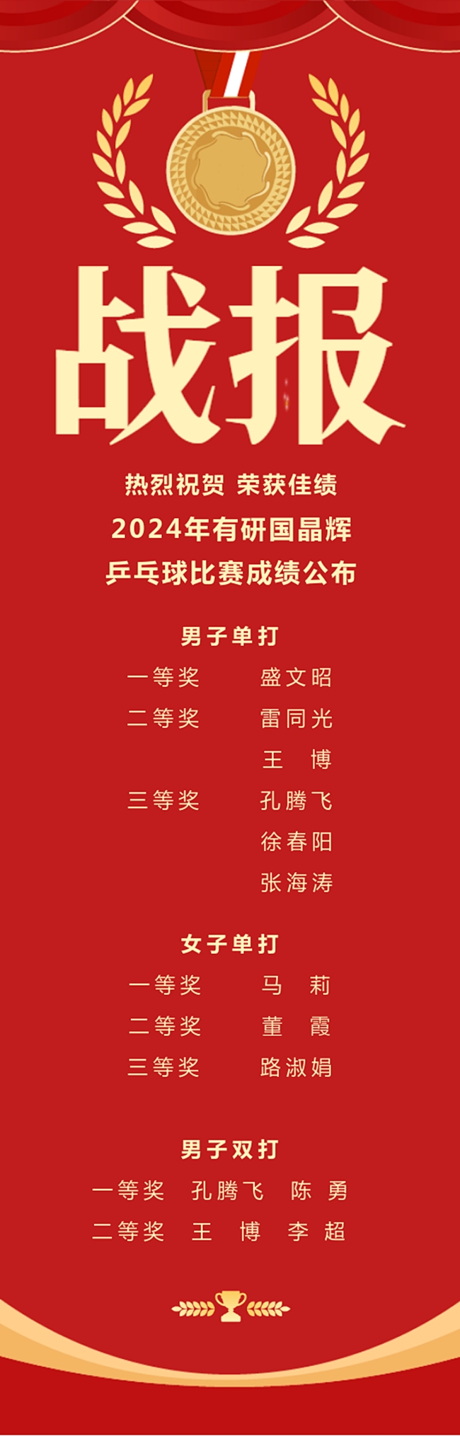 由有研国晶辉工会举办的职工乒乓球比赛经过数日的激烈角逐于近日落幕。本次比赛吸引了公司众多乒乓球爱好者热情参与,比赛设男子单打、女子单打和男子双打三个项目。