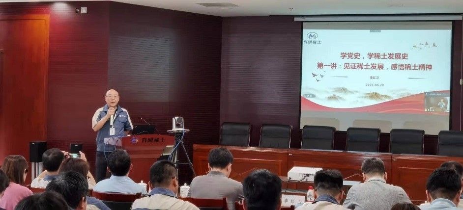 大会第四项,李红卫教授做“学党史•学稀土发展史”专题讲座第一讲——《见证稀土发展,感悟稀土精神》。报告从1956年有色院研究稀土领域开始,将有研稀土的发展划分为奠基创业、成长发展、公司化运营和高质量发展阶段,对每一阶段有研稀土取得的成就,面临的困难,克服困难的经验,为大家做了深刻的讲解,让大家更清楚地感受到有研稀土的前辈们筚路蓝缕,创业之艰,并从经验中汲取宝贵精神财富,更好地激励员工在工作中攻坚克难,勇于创新。