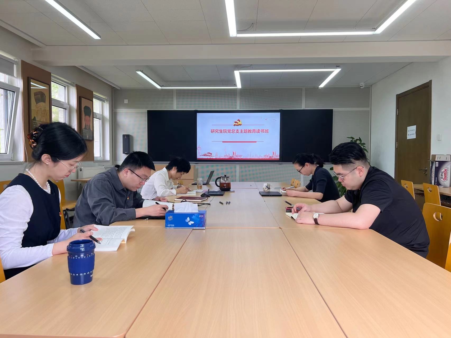 5月11日上午8时30分,清晨的阳光透过窗格倾洒在图书馆楼401教室的课桌上,一场有声有色的主题教育学习会正在进行。
