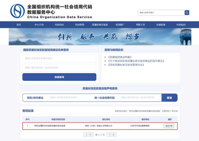 近日,国家市场监督管理总局印发第一批52家国家质量标准实验室培育建设名单,国标(北京)检验认证有限公司申报的“有色金属新材料国家质量标准实验室”成功入选。