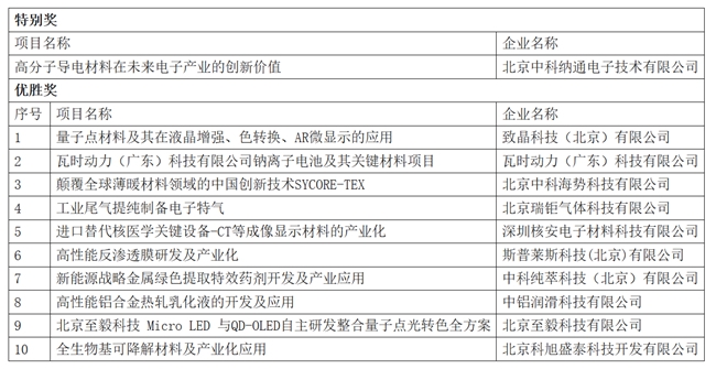 决赛评审团由具备深厚行业背景与实践经验的专家组成,从技术可行性、市场前景、商业模式等多维度,对参赛项目进行了专业点评与指导。经过激烈角逐,高分子导电材料在未来电子产业的创新价值项目获得了本次大赛的特别奖,量子点材料及其在液晶增强、色转换、AR微显示的应用等10个项目获得优胜奖。