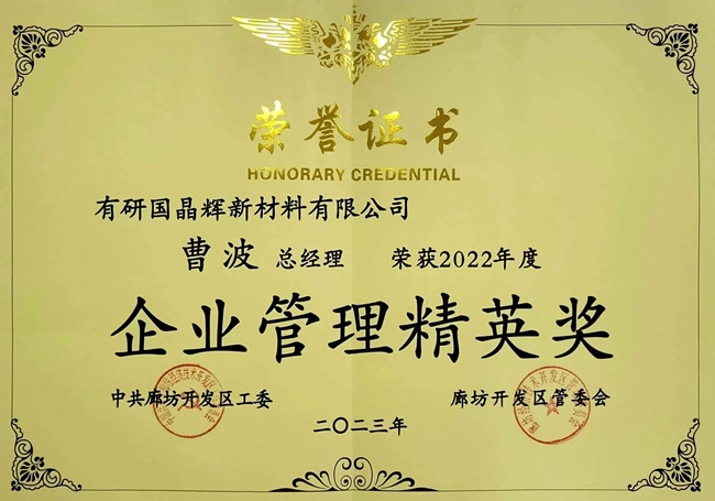 为表彰先进、树立典型,大力弘扬企业家精神,激励广大干部职工踔厉奋发、勇毅前行,不断开创各项事业发展新局面,经廊坊开发区党工委研究决定,对2022年度高质量发展优秀企业予以表彰,其中有研国晶辉公司被授予“优秀贡献奖”和“河北省科学技术奖”,并给予30万元奖励。公司总经理曹波同志荣获2022年度企业管理精英奖。