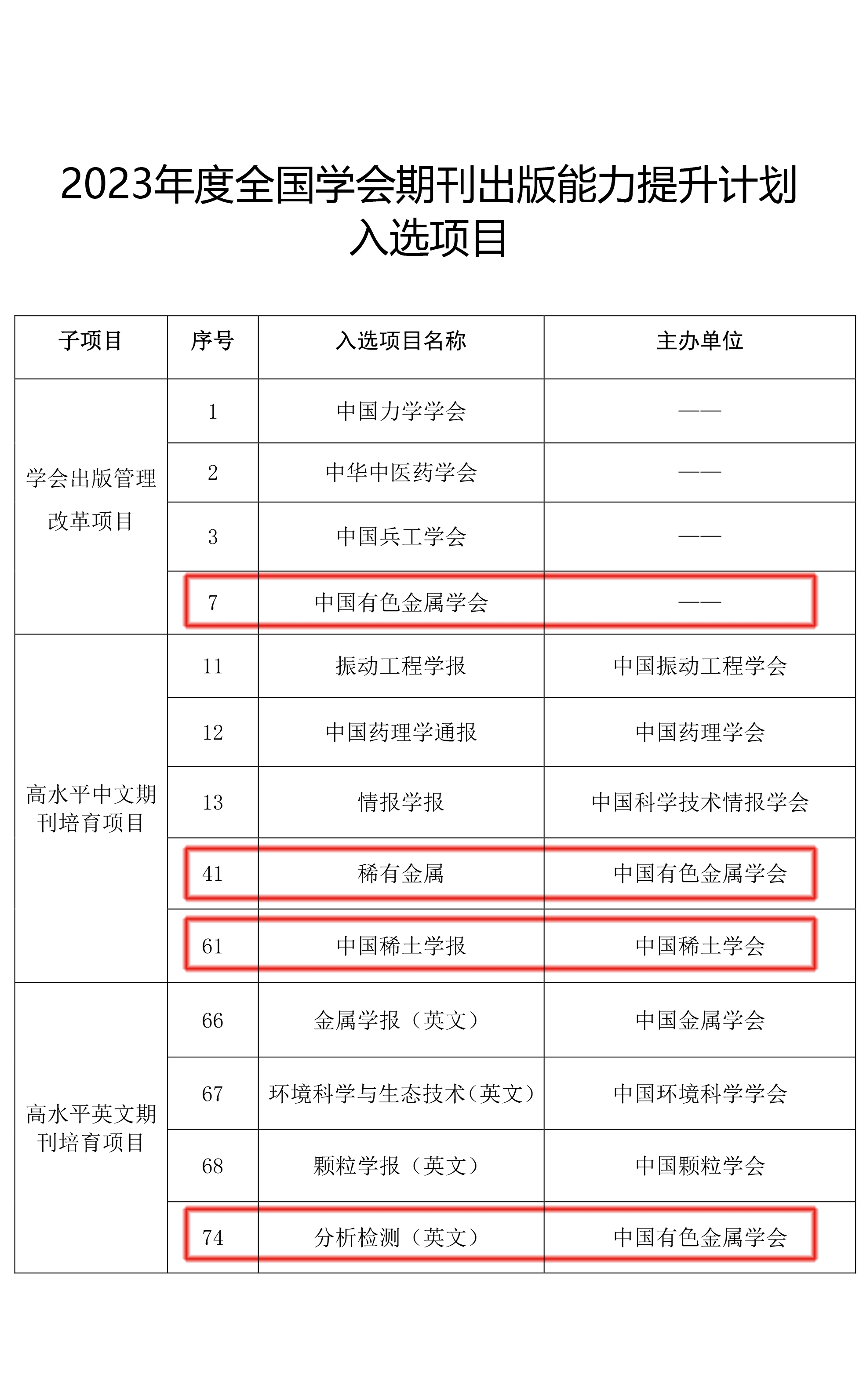 6月15日,中国科学技术协会发布了《关于公布2023年度全国学会期刊出版能力提升计划入选项目的通知》。有科出版入选四个分项,总金额60万元,较2022年增加一项,包括学会出版管理改革项目、高水平中文期刊培育项目两项、高水平英文期刊培育项目。入选项目由中国有色金属学会、中国稀土学会牵头申报,有科出版负责实施。