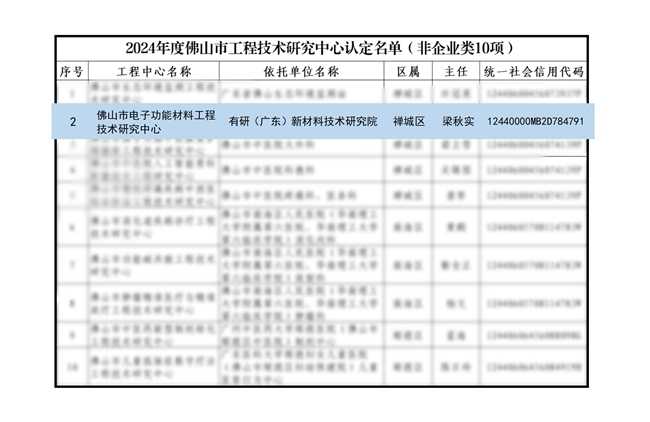 7月9日,佛山市科学技术局发布2024年度佛山市工程技术研究中心认定名单,由有研广东院申报的“佛山市电子功能材料工程技术研究中心”成功获得认定。