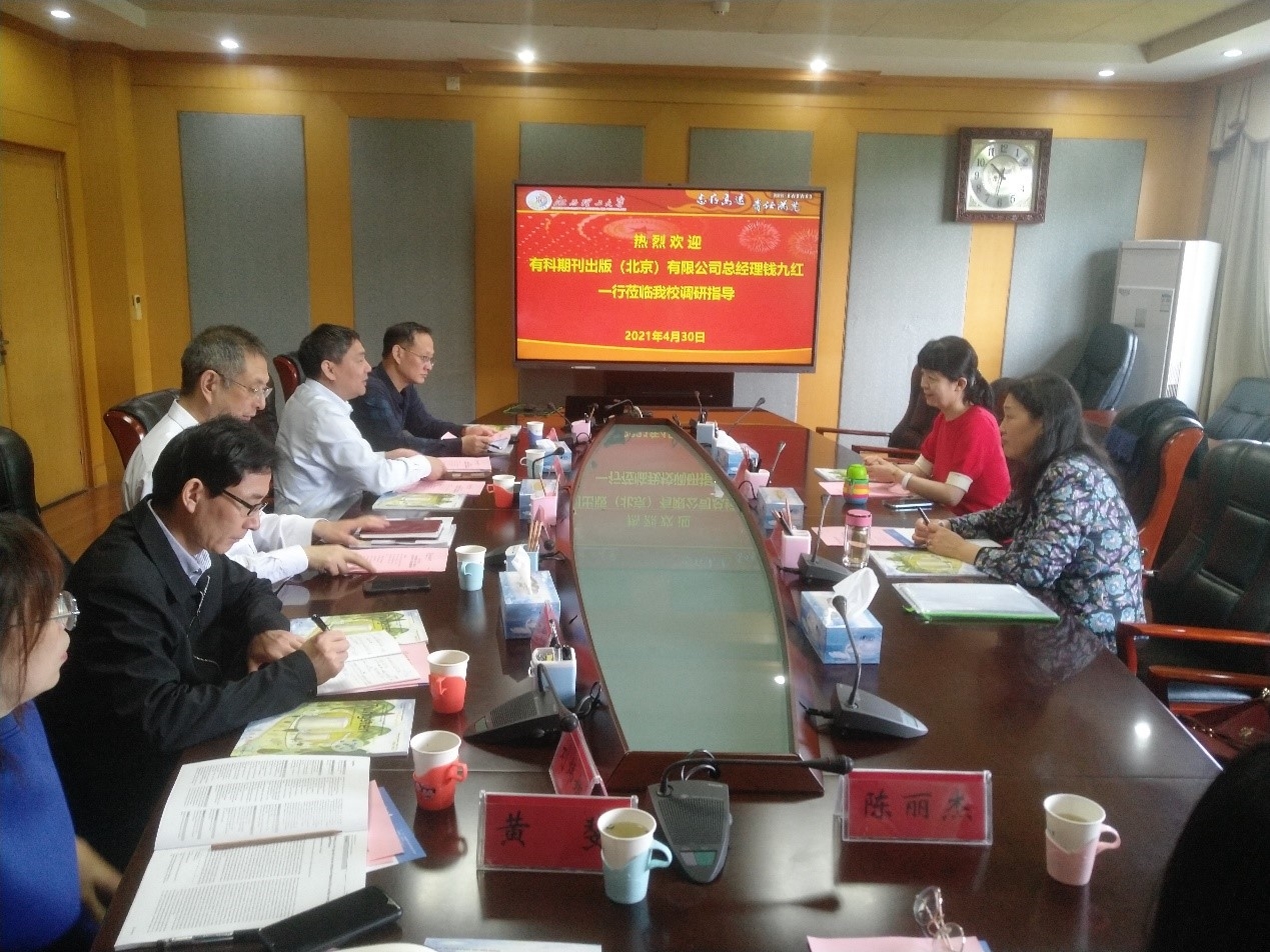 2021年4月30日,有科出版总经理钱九红一行赴江西理工大学期刊社就有色期刊集群化建设及校企合作办刊等事项进行深入商谈与交流。江西理工大学副校长罗仙平、期刊社社长黄志红、副社长曾伟明及期刊社各编辑部负责人出席。会议由罗仙平主持。会前,江西理工大学党委书记、《钨科技(英文)》主编杨斌教授会见钱九红一行。