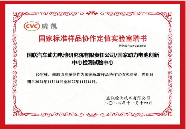 国联研究院国家动力电池创新中心检测试验中心获聘中国电器科学研究院股份有限公司CVC威凯“国家标准样品协作定值实验室”,并荣获“国家标准样品优秀定值实验室”。