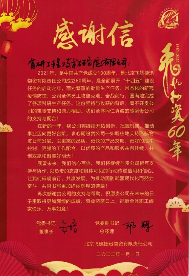 2022年伊始,有研工研院收到北京飞航捷讯物资有限责任公司发来的感谢信,感谢有研工研院在2021年给予的宝贵支持和鼎力配合。