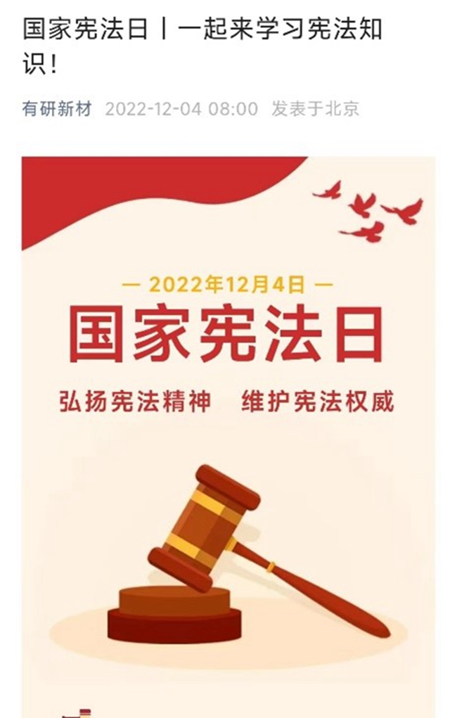 有研新材采取“线上+线下”联动的宣传方式,营造良好的法治氛围。充分运用微信公众号等线上平台,发布宪法宣传挂图和《国家宪法日一起来学习宪法知识》宣传推文,宣传现行宪法公布实施四十年来取得的伟大成就和有关宪法知识,增强了宪法宣传的吸引力和感染力,不断激发员工学习宣传宪法的热情。