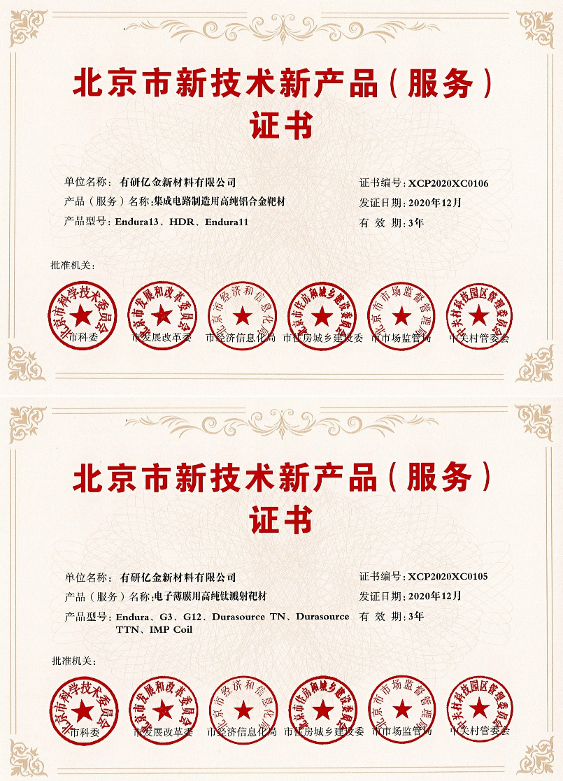 有研亿金新材料有限公司主持研发的“集成电路制造用高纯铝合金靶材”、“电子薄膜用高纯钛溅射靶材”等4项新产品成功获批。目前公司已累计获得北京市新技术新产品认定31项,覆盖了高纯金属原材料、高纯金属蒸发膜材、金属溅射靶材、功能材料等领域。