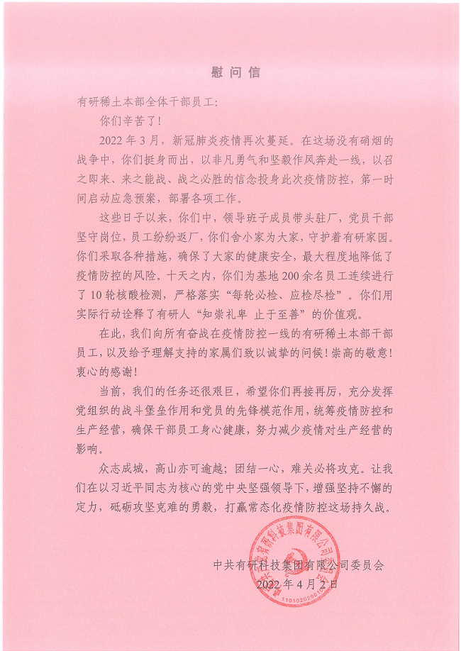 4月2日,有研集团党委分别给有研稀土本部、青岛公司、荣成公司发来慰问信,对公司统筹做好疫情防控和生产经营的成绩表示肯定,对坚守阵地、坚持生产的人员表示慰问。“在这场没有硝烟的战争中,你们挺身而出,以非凡勇气和坚毅作风奔赴一线,以召之即来、来之能战、战之必胜的信念投身这次疫情防控”,“领导干部带头驻厂,党员干部坚守岗位,员工纷纷返厂,你们舍小家为大家,守护着我们的有研家园…… 你们用实际行动诠释了有研人‘知崇礼卑 止于至善’的价值观”,这些滚烫的话语温暖着每一位有研稀土人,也鼓舞我们继续努力奋斗。