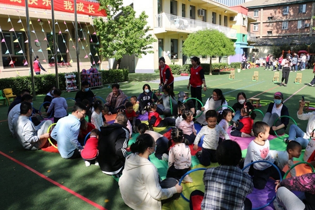 小班则是好玩的亲子运动会。结合小班幼儿的年龄特点,有研幼儿园设计了《母鸡下蛋》《给小兔子送萝卜》《猫和老鼠》《围裙接球》等趣味性、互动性强的亲子运动游戏;在体验运动带来快乐的同时,既增进了幼儿与同伴彼此之间的友谊,更增强了幼儿与家长之间的情感交流。小运动员们和爸爸妈妈们一起互动游戏,大家在欢声笑语中享受着幸福的亲子时光。