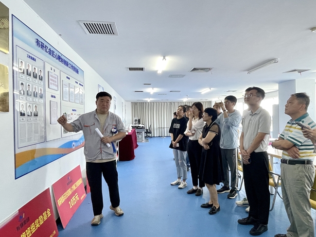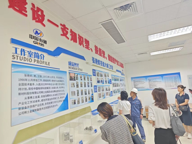 中央企业技能大师工作室领衔人、全国技术能手、国务院特殊津贴专家张艳岭带领大家参观了稀土车间以及工作室,跟大家分享了他带领工作室成员在工艺路线创新优化等方面开展的工作和取得的成绩等。