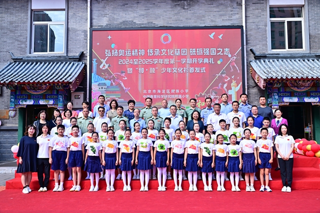 9月1日,巨乳成人视频 副总经理毛昌辉一行受邀来到海淀民族小学参加开学典礼暨“和•融”少年文化衫首发式。