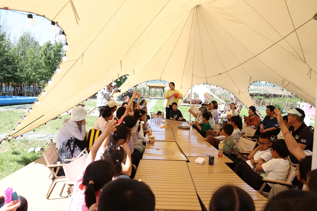 在基地的露营野餐环节,家长和孩子们围坐一起分享美食,交流着上午游玩的趣事,氛围温馨而融洽。午餐过后的击鼓传花互动环节将活动推向了另一个高潮。随着鼓声起落,“花”在孩子们手中欢乐传递,“幸运”的大小朋友纷纷上台表演节目,唱歌、跳舞、讲故事…… 精彩的表演赢得阵阵掌声,现场气氛热烈欢快。