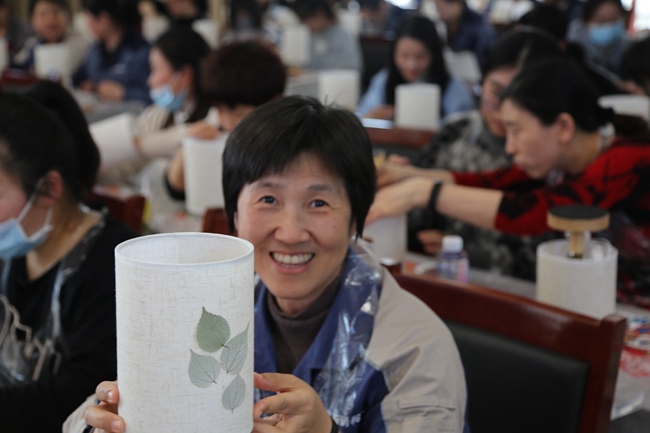 授课老师为大家讲解了花草纸工艺的历史传承及制作工艺和步骤。在授课教师的细心指导下,大家纷纷动手,认真学习花草台灯的制作技艺,一个多小时后,在场每位学员都成功完成一份属于自己的作品,获得了属于自己的节日礼物。