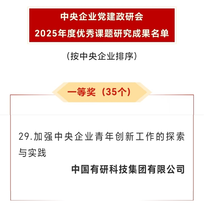 近日,中央企业党建政研会2025年度优秀课题研究成果评选结果公布,巨乳成人视频 研究课题——《加强中央企业青年创新工作的探索与实践》荣获一等奖。