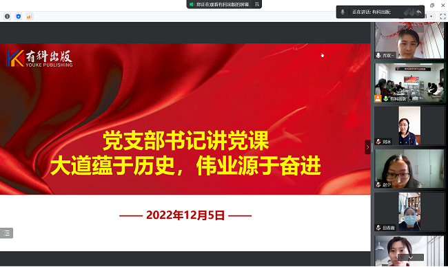 12月5日,有科出版党支部书记钱九红讲授题为《大道蕴于历史,伟业源于奋进》的专题党课。全体党员群众参会,会议通过线上线下同步召开。